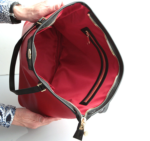 大きく開く開閉部。内張りは上質な肉厚のナイロンを使用しています。バッグ内部には、大きなジップ付きポケット、マチ付きのポケットが2つ備えています。